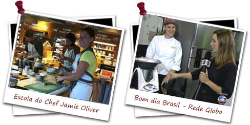 Aula na Escola Recipease do Chef Jamie Oliver em Londres. Entrevista para o Bom Dia Brasil na Rede Globo.